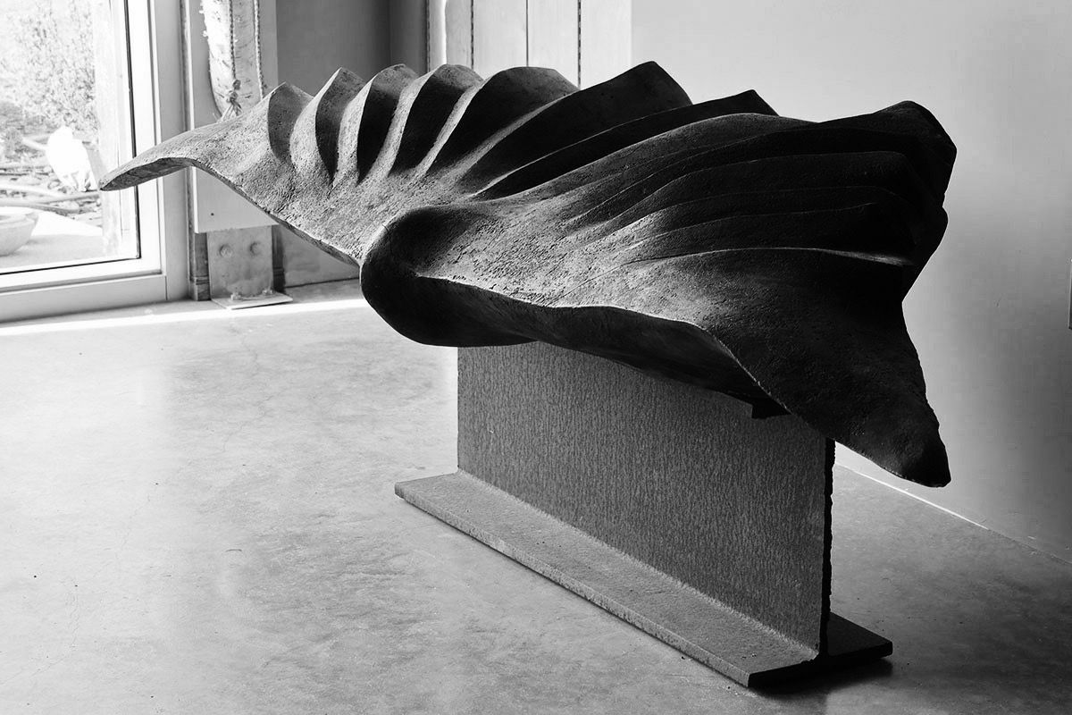 Calcium turned stone means life turned into mineral. Translating a nature of form into a sculpture as thing is about the manifestation of a moment of experience. Wings manifested in a "being" that relates in scale to our own physicality, allows for a meaningful encounter with form. The pieces talk about desire and transformation - and about being grounded on the earth.