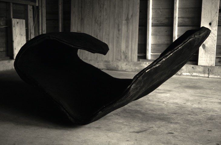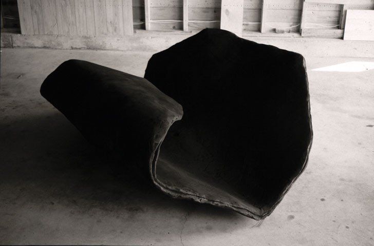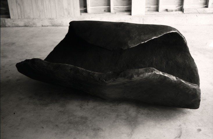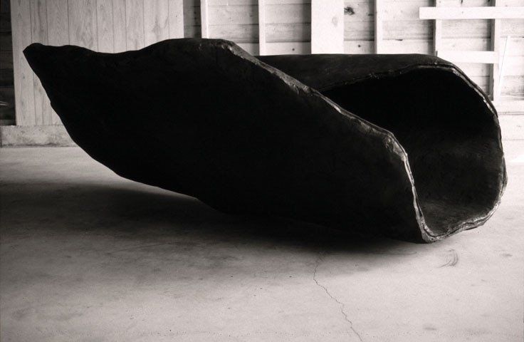 The Black Shield is worked in hydrocal plaster over wire and is finished with a black pigment. The rich, dark surface does not catch any reflections, but seems to suck the surrounding light into an existence as form. It balances on the ground and reaches up like a flower, a plant and indicates an inside that is almost like a half open cocoon and would allow a human body to find room, curled up, tucked in.