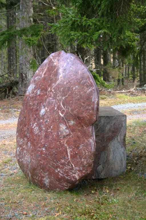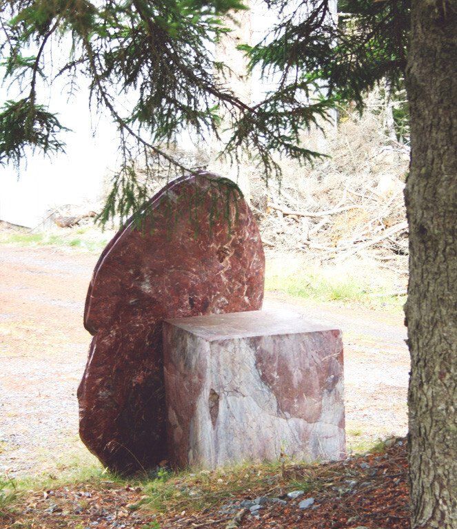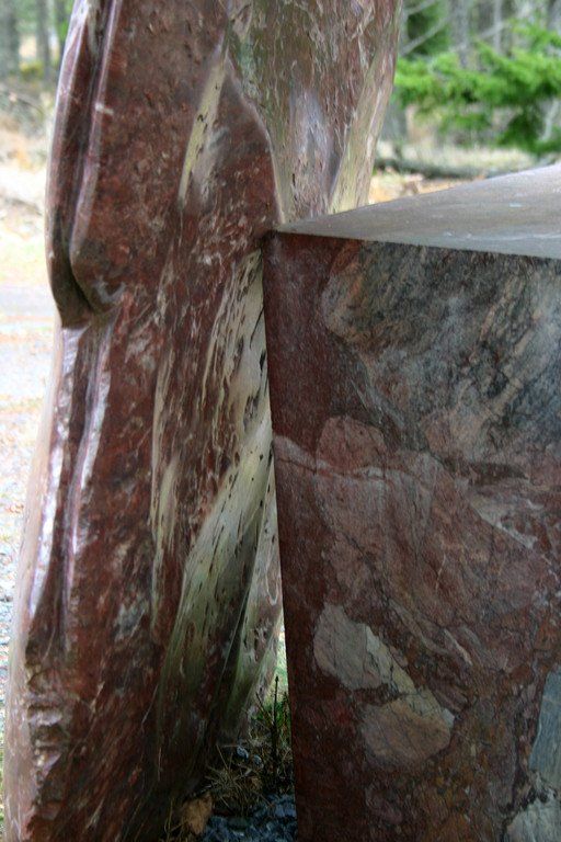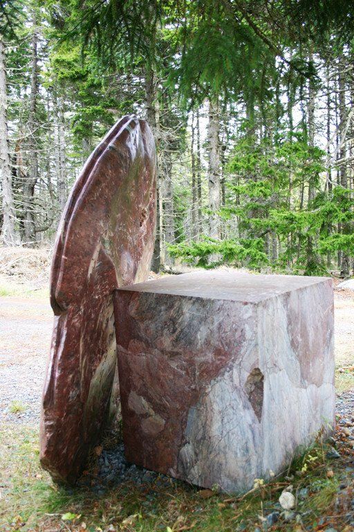 Vanessa Paschakarnis’s “Cape Breton Shield” is about 5 feet high, 4 feet wide and 10” thick and deals with some of the same basic questions of culture and nature and their inseparable existence. The “Cape Breton Shield” leans upright against a square block of the same marble that it is made from. The position of the shield reflects on our uprightness but intrinsic to the shape is that it has to be held upright. It has to lean against something, which indicates a rest, a balance as well as a potential for relocation. The duality within the piece is that it is large and heavy, yet not meant to be seen in a stable position. The work engages into an encounter with it as a thing that could be a shelter. Responding to our scale it refers to familiar shapes, but does not define any specific thing. The surface of the carving is heavily marked and then finished to a smooth surface so that it seems to be like skin, old skin, weathered skin, scarred and polished. The back and the front are distinctly different in texture. A groove around the edge of the Cape Breton Shield and a finger-size hole in the back suggest an inner presence. It talks about an unknown component, an inner space defined through the logic of form. This identity of the unknown in an object reflects on our urge of self-definition. The Cape Breton Shield alludes to the essence of an encounter, an encounter with form as a thing and the thing as equal companion. It reflects on the human desire to interact with our surrounding. It confirms us as beings that are part of the natural world. (excerpt from an essay for the Atlantic Stone Carving Symposium by Vanessa Paschakarnis)