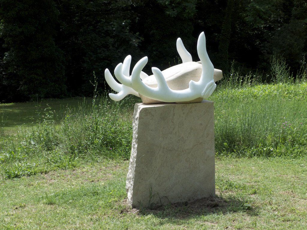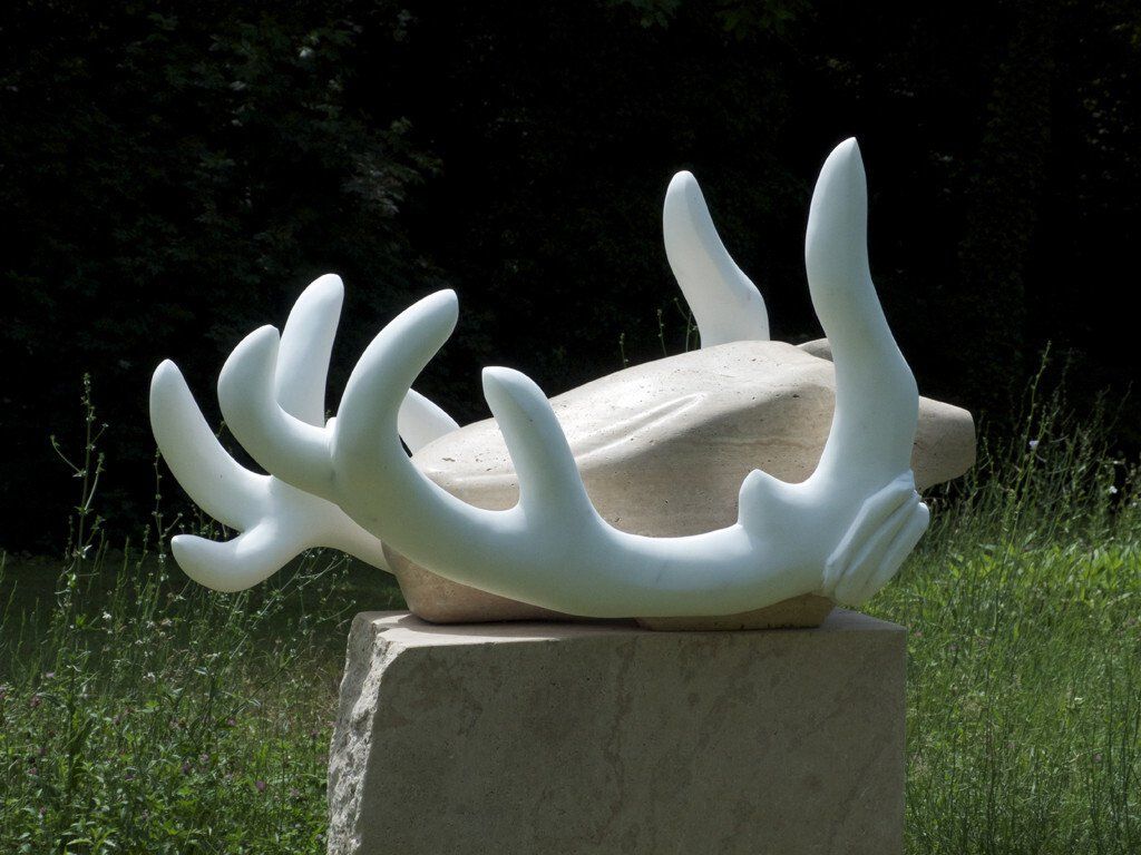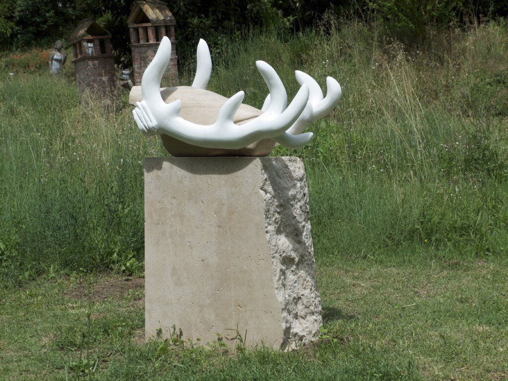 Cavallo is a continuation of the Domesticated Beasts series that developed into a series of sculptures that demonstrate the duality of our relationship to the animals that we domesticate. Here the horse head is mounted with bridles made of deer antlers. The horse is turned into a weapon again, a proud creature that humans abuse to go to war. It is a monument to the horse as a wild and independent creature.