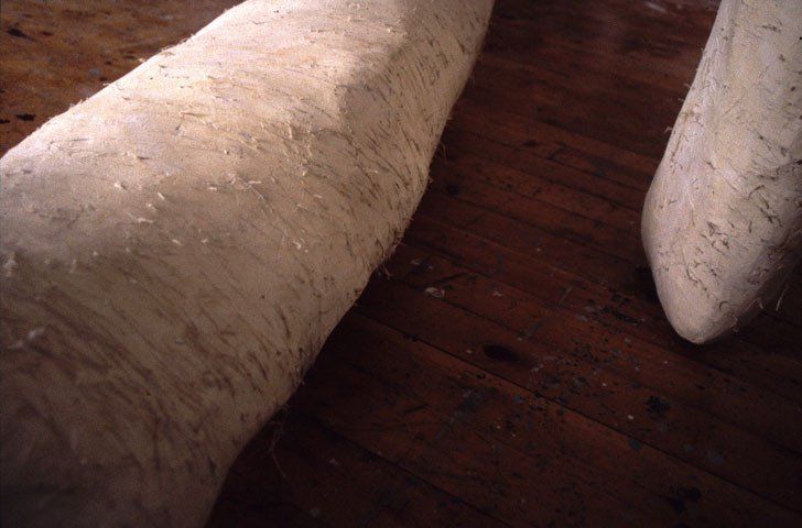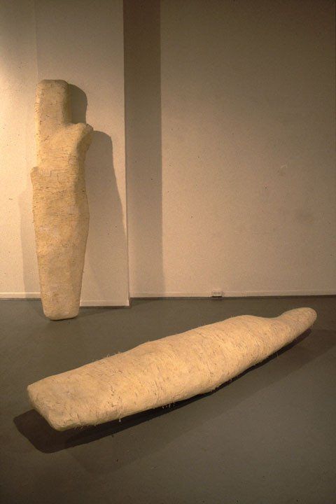 In Verbindung mit einer Gruppenausstellung, in der die Arbeit war, schrieb ich folgenden Kommentar: Die weiche Oberfläche der zwei Formen ist gebunden, bearbeitet und eingeritzt, eingeschnitten mit feinem Garn aus Leinen, das sich aufschichtet und die Spuren der ursprünglichen Form der Skulptur nachzeichnet. Sie sind nicht statisch, entweder ruhen sie auf dem Boden oder lehnen gegen die Wand, eine Säule. Die Objekte scheinen vertraut, körperlich in ihrer Erscheinung, aber im selben Moment verunklären sie unsere Wahrnehmung, denn ganz offensichtlich manifestieren sie etwas Fremdes und Unbekanntes. Sie bestärken ein in Frage stellen, ein Untersuchen, verändern die Atmosphäre eines vorhandenen Raumes, indem sie dem menschlichen Körper Skulpturen, gemachte Formen entgegenstellen, die von einer entsprechenden und sich gleichzeitig widersetzenden Größe sind.