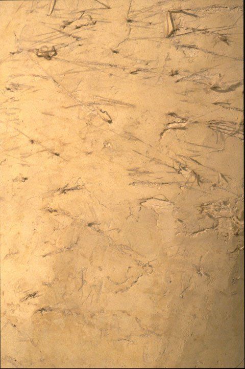 "Corporeal" consists of two forms that are worked in plaster, a yellowish hydrocal. The surface of the pieces appears layered and woven. It reveals fibers that merge with the almost skin-like or wood-like plaster surface. The shapes are things in themselves (about 240cm long/high and between 30 and 60cm in diameter) that allow for various associations. Like driftwood rather than wood, they allude to some natural material that has taken a form which vaguely reference the proportions of the human body. One element rests on the floor, the other leans against a pillar. A comment that I wrote in connection to a group show that I participated in is as follows: The smooth surface of the two forms is wrapped, worked and incised with fine linen yarn, thus layering up and tracing the nature of form of the objects. They are moveable, either resting on the floor or leaning against the wall, a post. The objects seem to be familiar, corporeal in their appearance, but in the same moment they obscure one's perception by obviously manifesting something strange and unknown. They enforce a questioning, investigating, change the atmosphere of an existing space by opposing the human body with sculptural objects of a similar and confrontational scale.