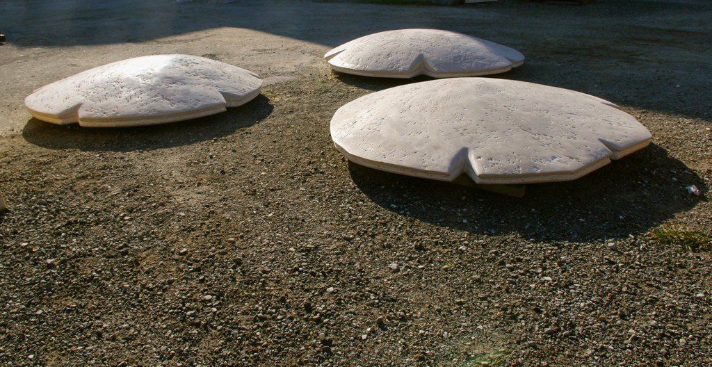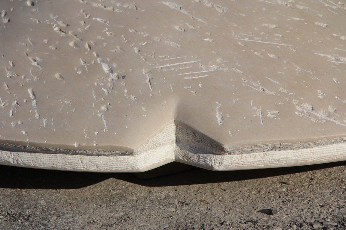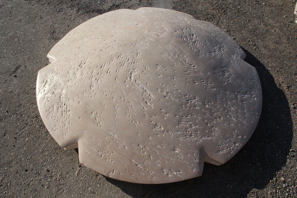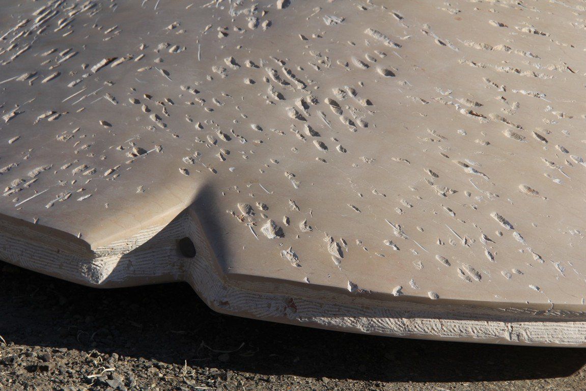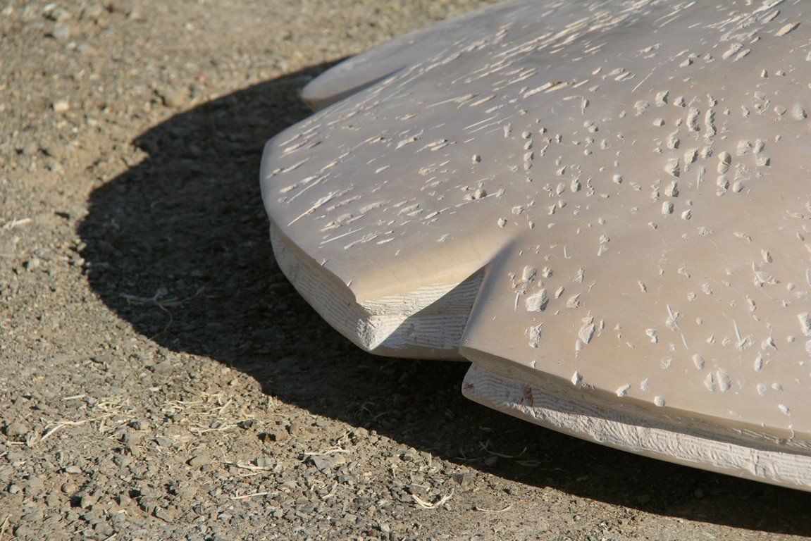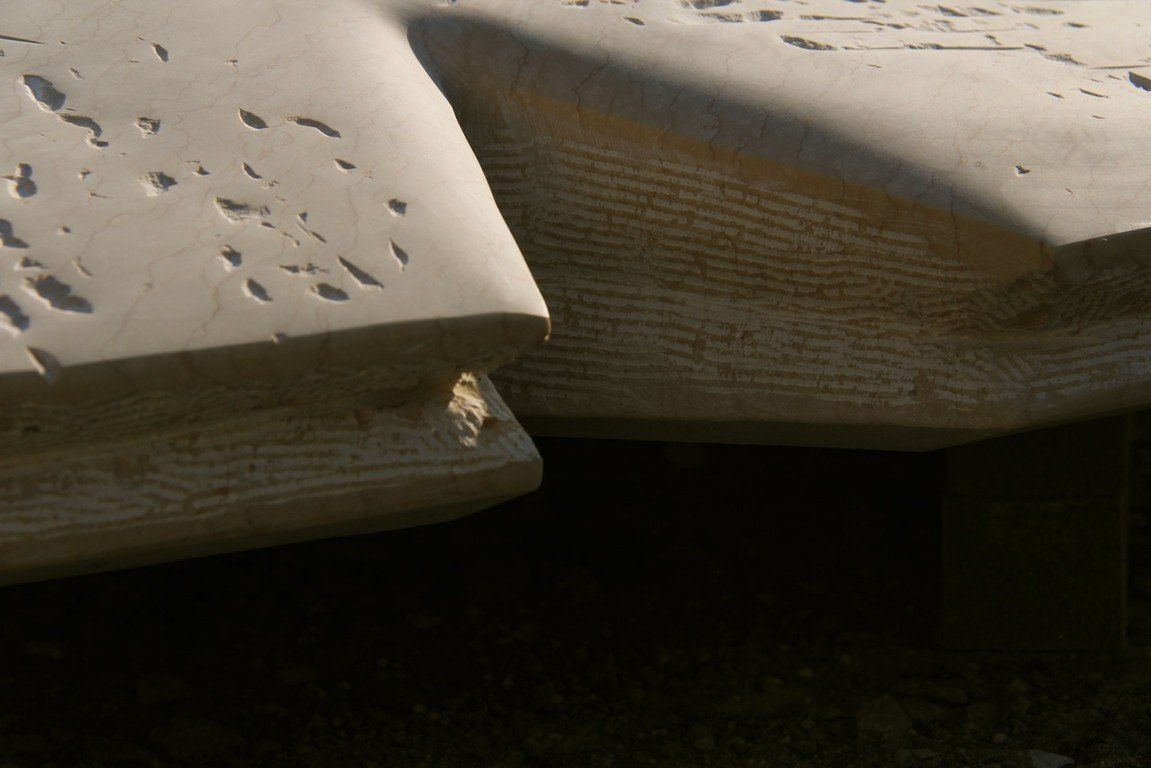 These Shield-like shapes recreate an environment that allows the viewer to stroll among them like on a walk in the desert, the ground this stone comes from, the Egyptian desert. In their scale, they won’t allow us to observe them in their entirety once we are up close, we become an element next to them. The surface is a pale sand color with dark orange ripples running through. They encourage our “walk through the desert”, reflecting on being immersed among things made for consideration. They are an invitation to dream.
