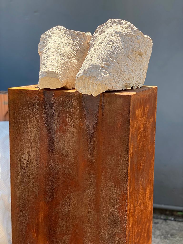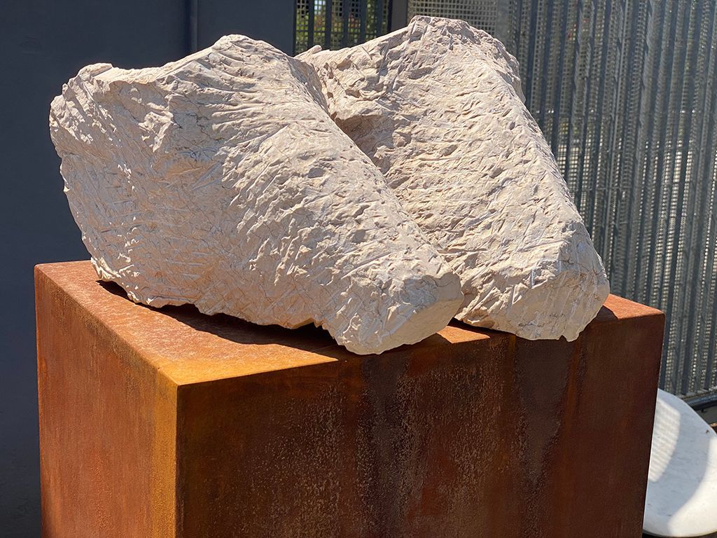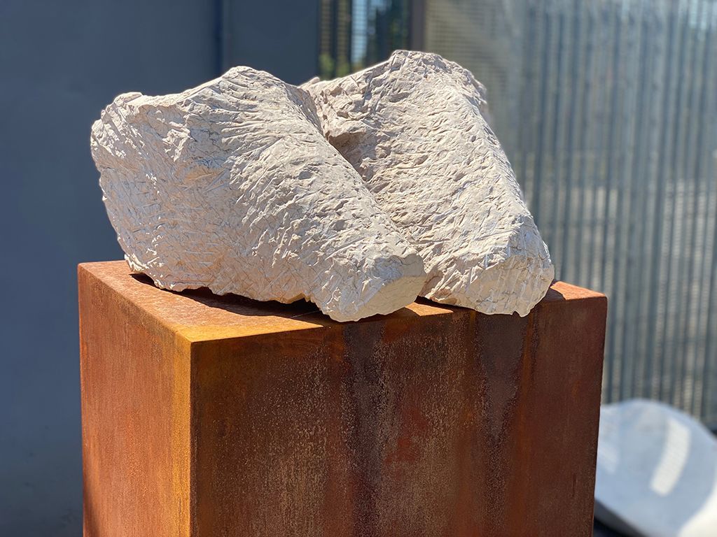 The Couple is a piece that relates to my work “The Herd”. These stylized animal heads are carved like masks in stone. The surface of the light coloured stone is very reminiscent of animal fur. Its visceral quality relates to our senses and wants to be touched. I use these heads / masks as metaphors for the human soul. These are a reflection on a couple in love. Through a gesture in the pairing, they become animated and we relate to them as the other in us.