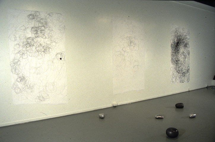 The sculptural forms were accompanied by a series of drawings. These were recordings of movements of stones on paper. I placed a stone on paper and moved it with a pencil that was immediately tracing the movement that was defined by the specific shape of a rock. Some were made as "portraits" of specific stones that were moved once over a paper surface and left an individual mark through the pencil. Some of the drawings were enlarged to a confrontational scale to the human body.