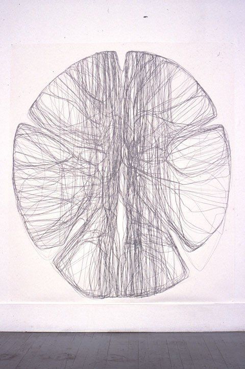 The exhibition "Shields" was realized in the following summer 1998 in Halifax. I always emphasize the importance of drawing to my art practice , so I decided to show only drawings. The "Shields" are large scale drawings, graphite on paper, about 150cm x 180cm in size, that are installed on the wall as low as possible to the ground. I worked with the shape of a sand-dollar and began a quest in regard to its form with drawing, similar to what I started with my sculptural work at that time.