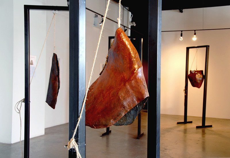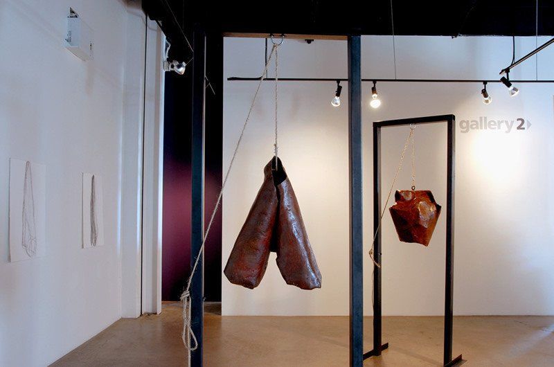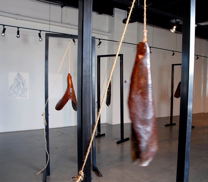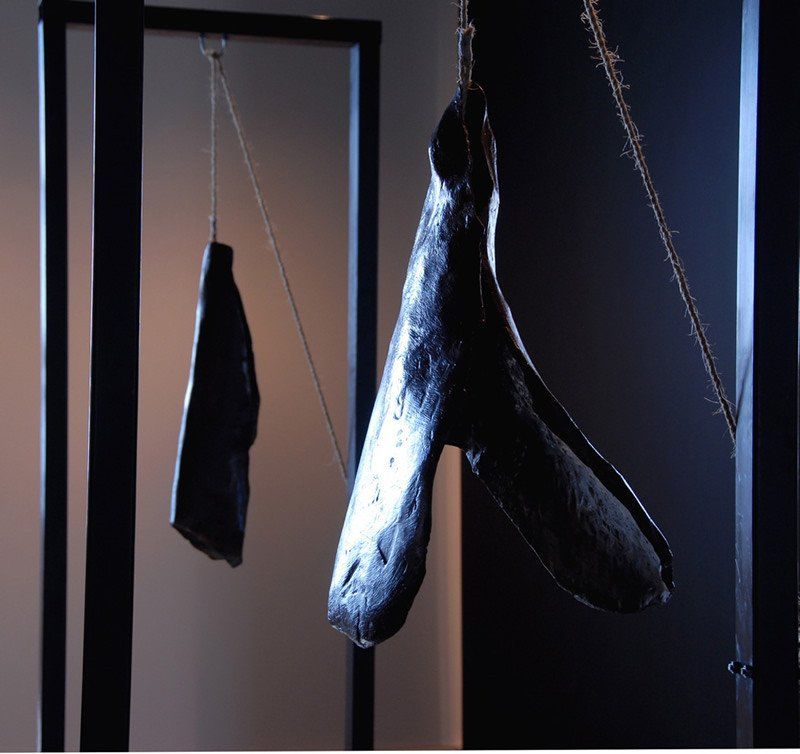 The five elements comprising the installation are large, but intimate at the same time. The frames are like doorways; the bronze elements—the Shadows for Bells—are scaled very directly to the human body. They are the length of an arm, the volume of a torso. The forms hang on ropes in various heights in the frames, encouraging an encounter. They move and resonate sound.