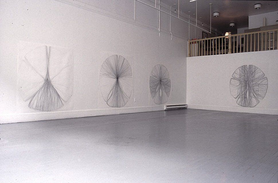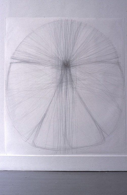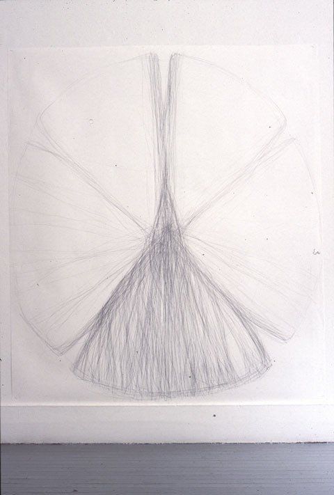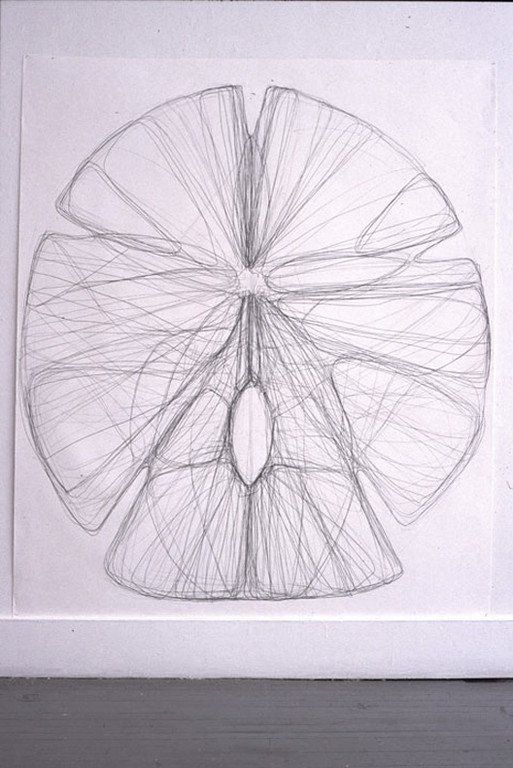 The exhibition "Shields" was realized in the summer of 1998 in Halifax. I always emphasize the importance of drawing to my art practice , so I decided to show only drawings. The "Shields" are large scale drawings, graphite on paper, about 150cm x 180cm in size, that are installed on the wall as low as possible to the ground. I worked with the shape of a sand-dollar and began a quest in regard to its form with drawing, similar to what I started with my sculptural work at that time.