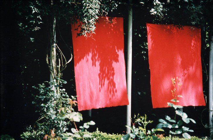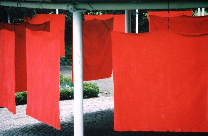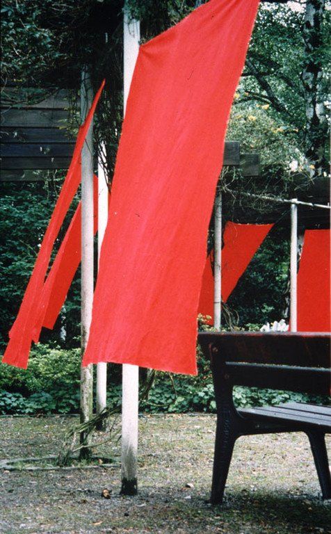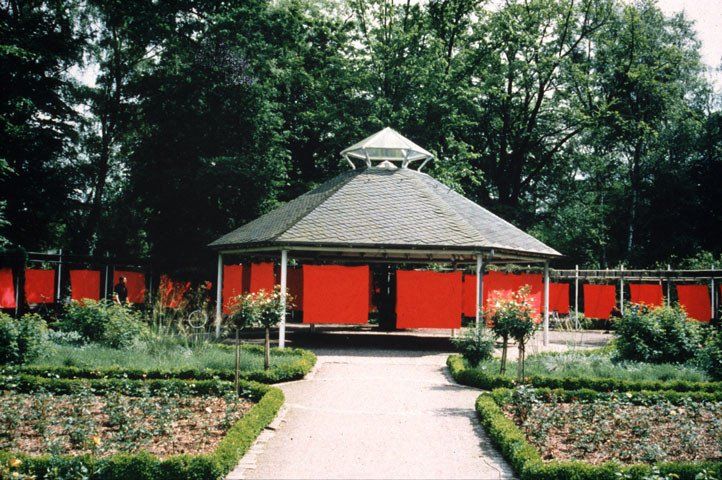 In a construction of metal poles and a central Pavillon-structure I installed 32 large pieces of canvas, forming a half circle with a full circle in its centre, at one end of the garden. Each of the canvases was 150cm x 170cm in size and painted on both sides in what I call a classic rose-red colour. Green strings fastened to the top edge of the canvases held them in place, so that they hang free and were able to be moved by wind. As well, for any person it was no problem to move them in order to pass through as if pushing a curtain to the side. The piece interfered with the paths that visitors had to take in order to cross the garden for a walk through different areas of the park.