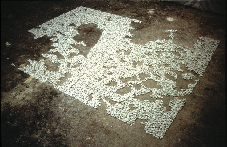 I sat on a huge granite rock under a large tree, resting in the shadow in order to escape the glittering sun. As I merged with the shadow of the tree and looked at it, I was fascinated by its presence in this very moment. The tree was my shelter and the image of the shadow on the rock became a symbol of the cooling spot I found for myself. I took a photo of the shadow and carried it away with me. Two years later (in 1993) I realized a piece based on that moment and titled it "shadow of a tree". I worked with the size of the photo and dedicated a rectangle of the floor in the exhibition room for it (130cm x 180cm). I arranged white marble pebble-stones in the shape of that shadow on the floor. The piece is a sketch, a drawing. It is about my approach to my work. With my work I want to share my experience. Yet I am not interested in illustrating it or informing others about it. I want to put work out that initiates experience as a thing that one has to engage with. I am working with images in order to facilitate an engagement yet I avoid to define images, so that they do not become barriers for the mind. The rectangle in "shadow of a tree" refers to a paper size, an extract, a cut-out from a whole, a selection. The material is stone, yet pebbles of marble, glowing white. It is a natural material, naturally shaped and formed, yet extracted from a process of quarrying stone. A left-over product that you buy in bags in a garden center. The pebbles are arranged in the shape of a shadow of a tree. It is an image with material, has its own material presence. Obviously it is not a tree, but through the image, a stony shadow, it works as a sign with its own presence. The material makes it difficult to grasp the image - it even has its own subtle shadow. It is a drawing on how we perceive, how we extract, how we share, and how we let it go alone. A little sketch, not more, but it is an example for a basic question that still is part of my investigations. We are alive, move and try to understand the world around us. The different cultures are initially reflections on our surrounding, a form of nature. We move and engage with other beings. We have a sensory perception that enables us to engage with the outer world. We have languages in order to communicate, sign systems that are (more or less) agreed upon and function as a basic tool. My investigations take place in the language of drawing - as a concept - and in the language of sculpture - as a real thing. I am interested in touching people through my work, in directing an engagement that is physical and mental and hopefully changes a bit of their world.