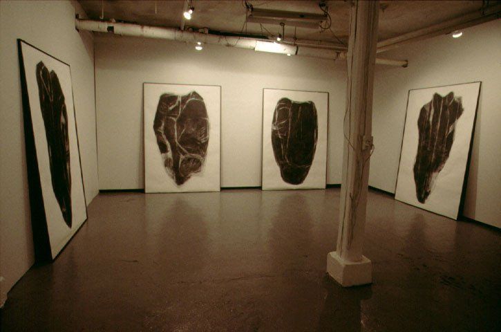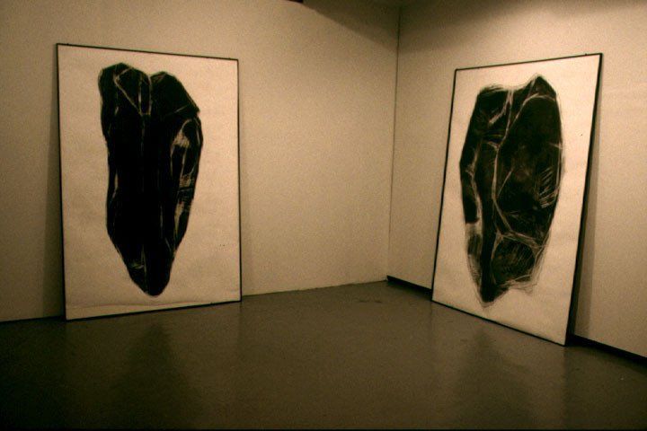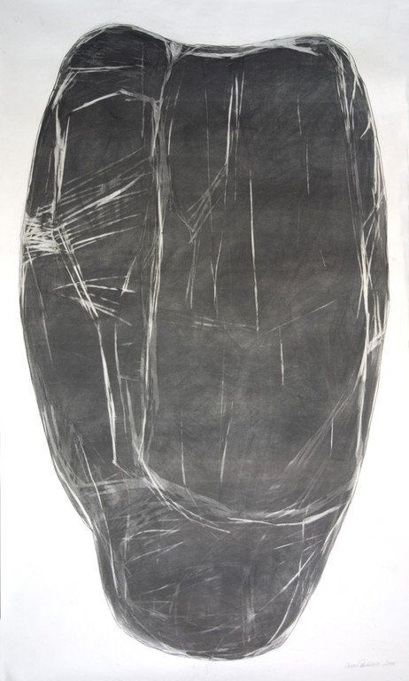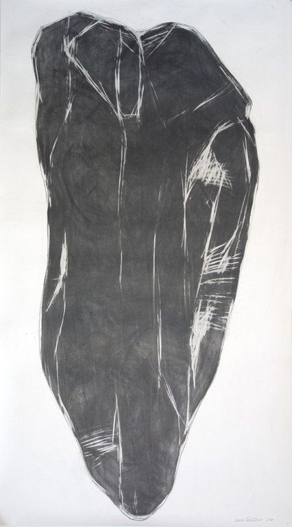 As drawings, the "shields for humans" series works on a similar level as the "black shields" series does. Here I emphasize the frontality and mass of an imaginary shield-like form. The drawings confront a person as a massive, yet at the same time almost fragile form. Various layers of graphite powder are worked and incised by pencil and eraser-lines. As drawings they build up a tension that plays with the viewer's physicality.