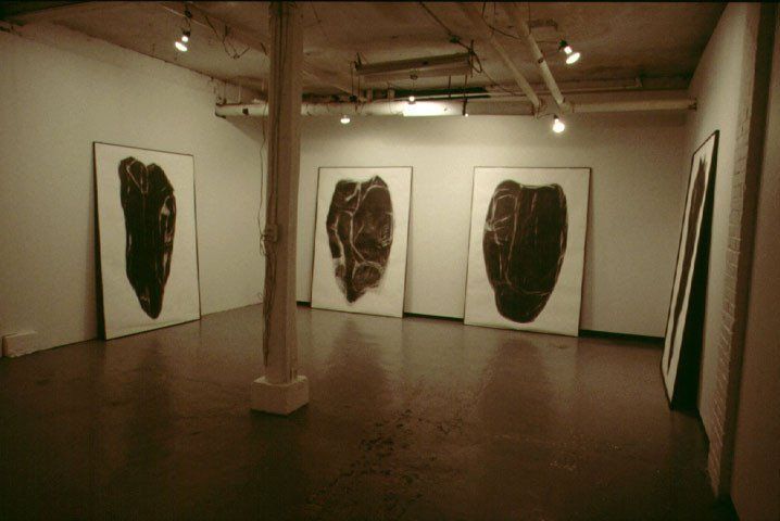 The steel frames clearly set them as two-dimensional planes in the room. They ensure the freedom and the restrictions of a picture plane and toy with the aspect of a shield in regard to a person's body.