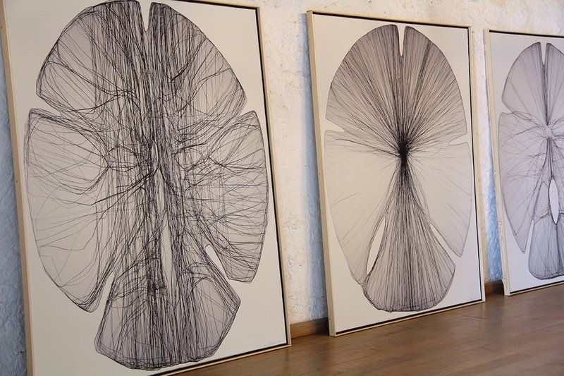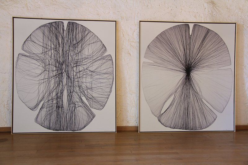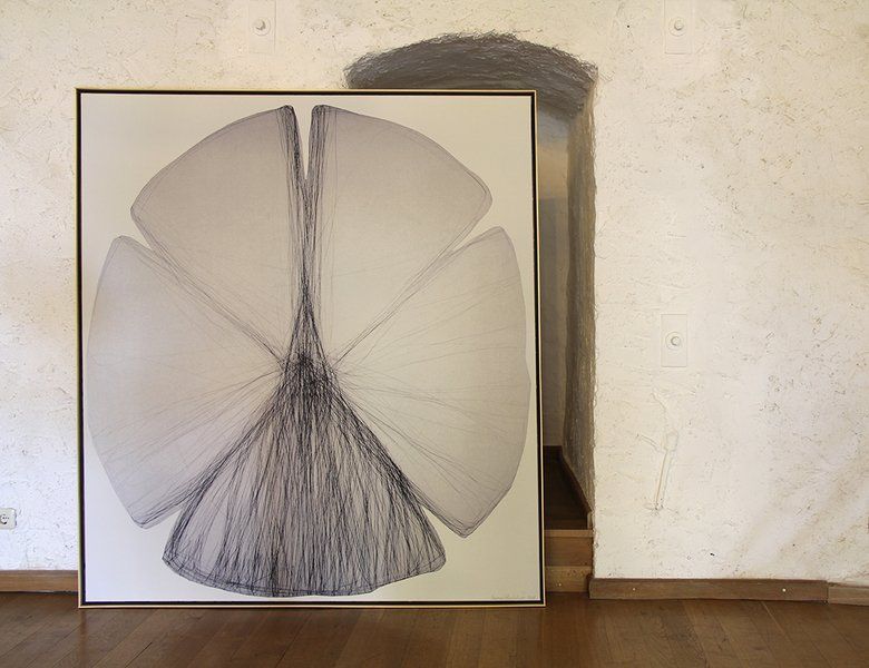 These are my shield drawings scanned in a high resolution and re-worked as digital files to represent the shield shapes as things, rather then a surface covering drawing. Printed on banner linen they can be stretched like a canvas and are unproblematic and don't need to be behind glass. The scale is one to one with the original drawings, 1,65m x 1,85m. Here just placed on the floor as part of an exhibition in a castle.