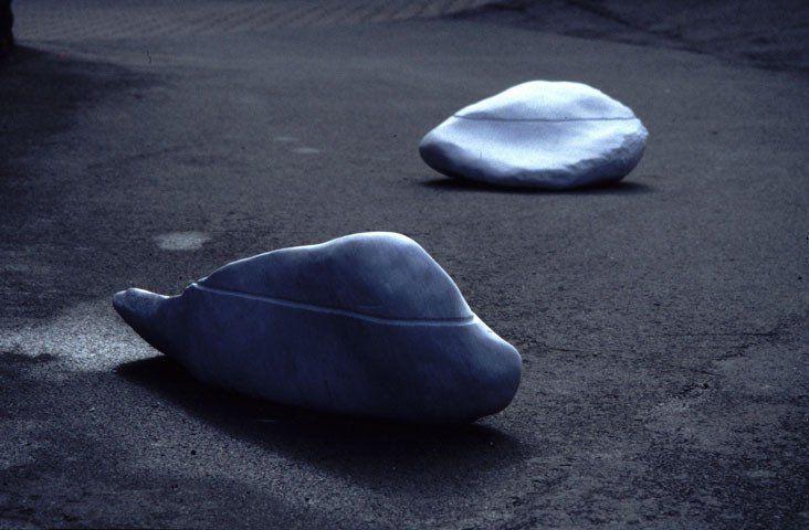 The two oversized pebblestone-like forms of the piece are marked by a line, indicating a level above ground that would cover the viewer's feet up to the ankle.