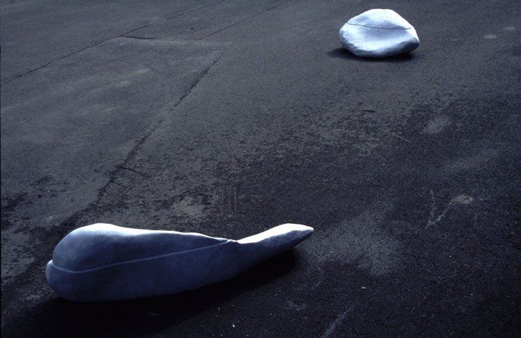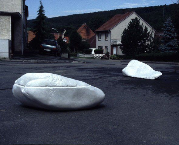 Encountering the work you are lead to move around the pieces that are facing each other over a distance of almost three meters. The stones appear to be soft and smooth from a distance, but when approaching them, they reveal a surface covered with marks and scratches. Whole parts seem to be torn away at the edges, seem to be washed out with the flow of time. The objects remind of familiar pebblestones, but in their size in between object and material they could be bone or wood or shell or stone...