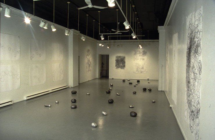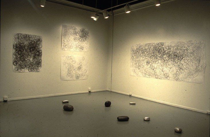 The sculptural forms were accompanied by a series of drawings. These were recordings of movements of stones on paper. I placed a stone on paper and moved it with a pencil that was immediately tracing the movement that was defined by the specific shape of a rock. Some were made as "portraits" of specific stones that were moved once over a paper surface and left an individual mark through the pencil. Some of the drawings were enlarged to a confrontational scale to the human body.