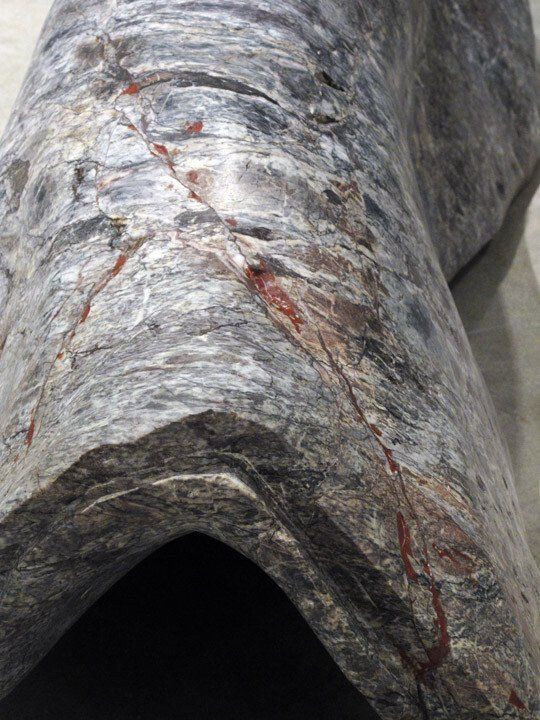 These thoughts are evident in Shadows for Humans (2003-2004). As with all of Paschakarnis' sculpture, the three large, carved marble elements that constitute this work are scaled in response to the human body. In turn, they collectively create a space that engages one's self through their physical nature and by drawing upon one's intuition in guiding your encounter with them. While stationary, as one circumnavigates the works they become animated by one's movements - they seem to unfold, fold over, etc. - and your experience of them. while the three elements are distinctly unique, they reference, or shadow if you will, one another in character, surface and form. This idea of shadowing, as per the title and in concept, is revisited in Shadows of Domestication (2010), a new series of pedestal based sculpture. Here, in worlds subtitled tomcat, horse, ladycat, the artist uses a new material, Winterstone, a multi-component cement-like sculpting medium, to pull molds from pre-existing carved stone works. In grouping and mirroring the resulting skin-like forms, Paschakarnis arrives at a series of hollow, vessel-like sculptures that, in effect, serve as a memory of those which cam before them."