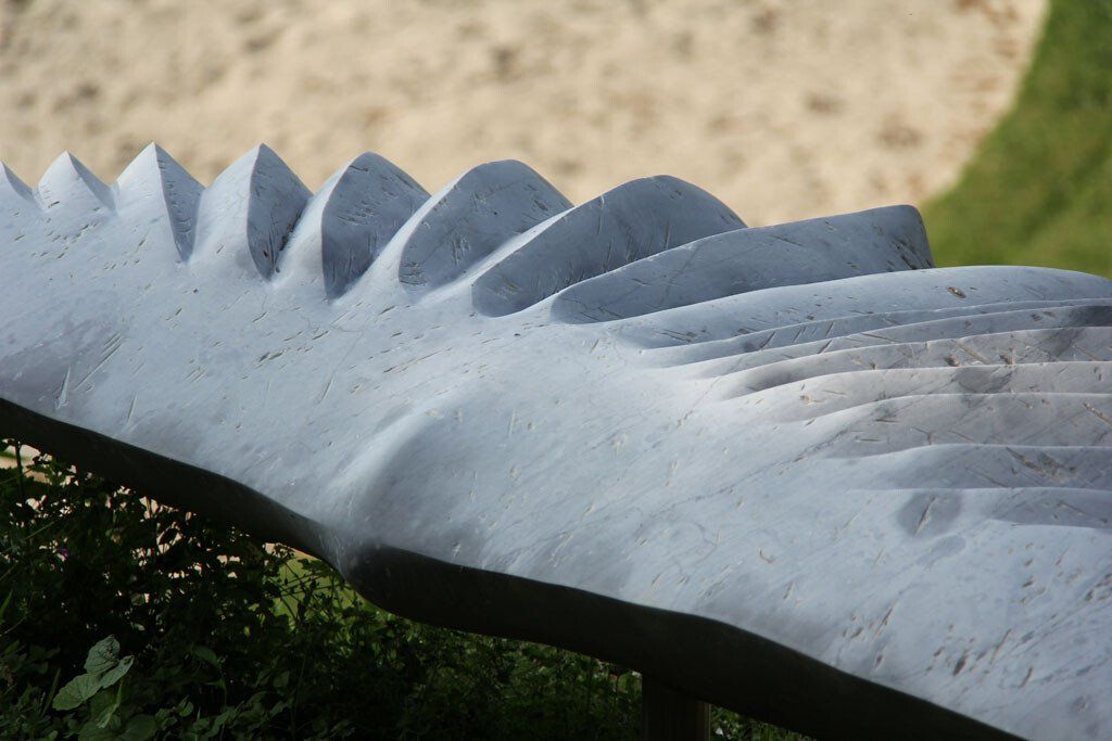 In meinem „Winged Being“ verstärke ich dieses Muster und vergrößere die Form so, dass es zu einem konfrontierenden Gegenüber für einen Menschen wird. Die Form wird zu einer Kreatur, die nur aus Flügeln besteht, schwer und doch leicht, schwebend und doch geerdet. Die Skulptur spiegelt die großen Raubvögel wieder, die mit weit geöffneten Schwingen, gut sichtbar vom Boden aus in die Luft steigen.