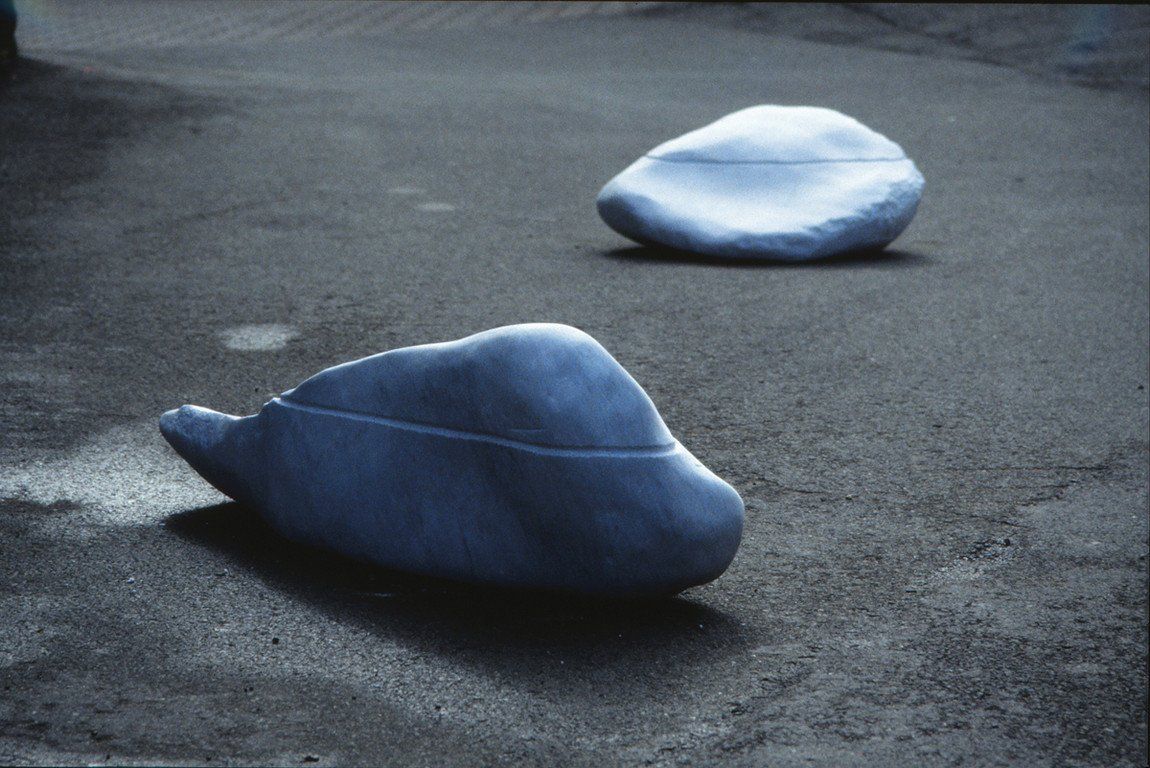 Encountering the work you are lead to move around the pieces that are facing each other over a distance of almost three meters. The stones appear to be soft and smooth from a distance, but when approaching them, they reveal a surface covered with marks and scratches. Whole parts seem to be torn away at the edges, seem to be washed out with the flow of time. The objects remind of familiar pebblestones, but in their size in between object and material they could be bone or wood or shell or stone...