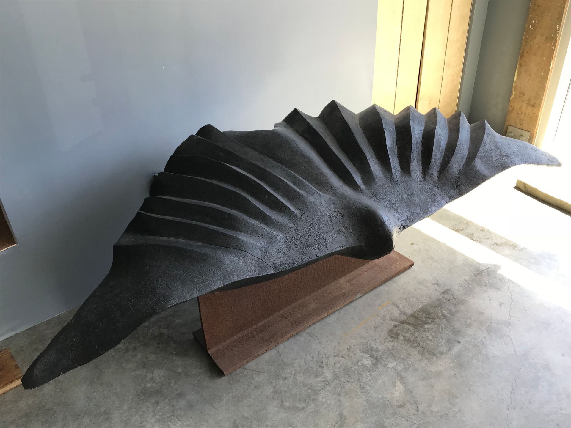 Calcium turned stone means life turned into mineral. Translating a nature of form into a sculpture as thing is about the manifestation of a moment of experience. Wings manifested in a "being" that relates in scale to our own physicality, allows for a meaningful encounter with form. The pieces talk about desire and transformation - and about being grounded on the earth.